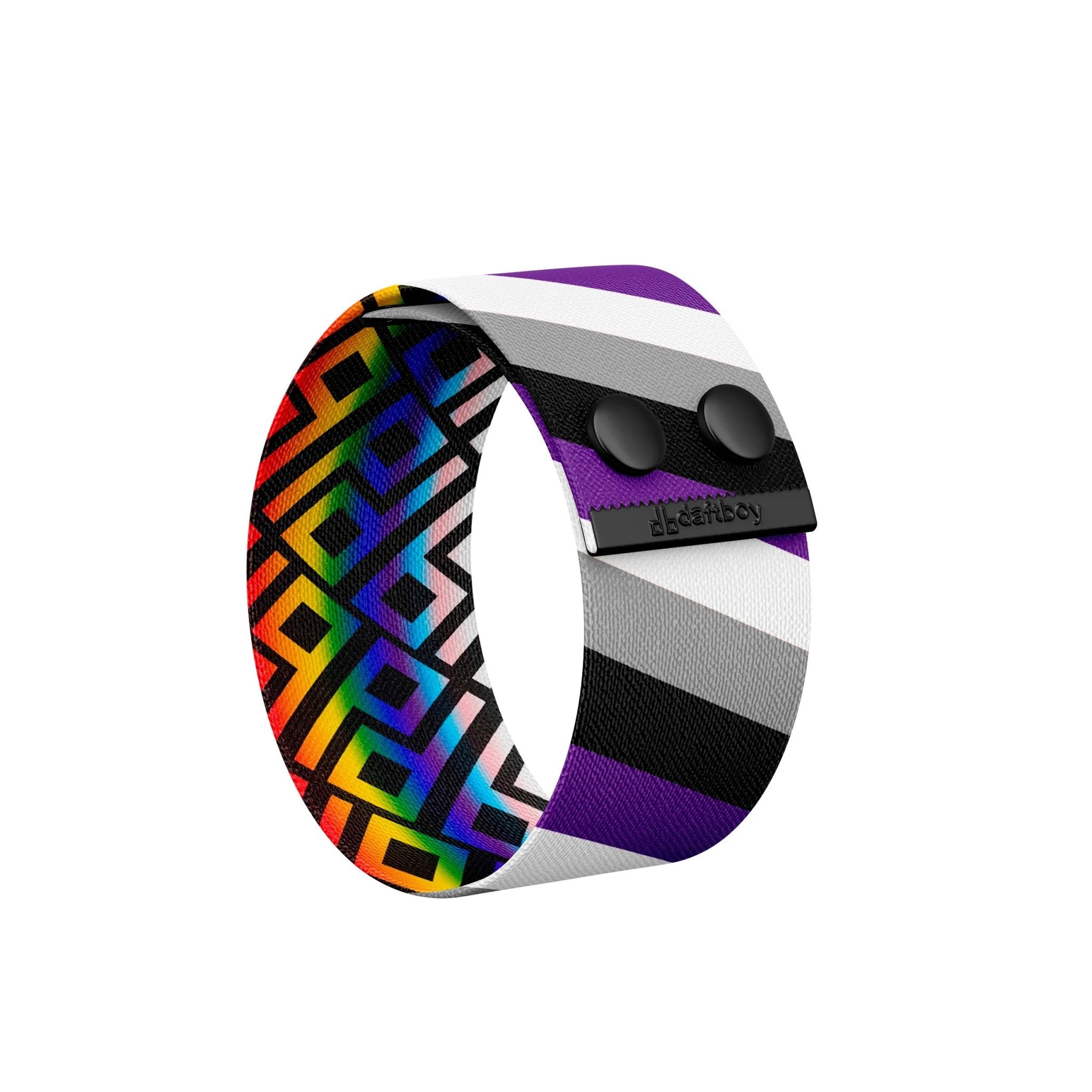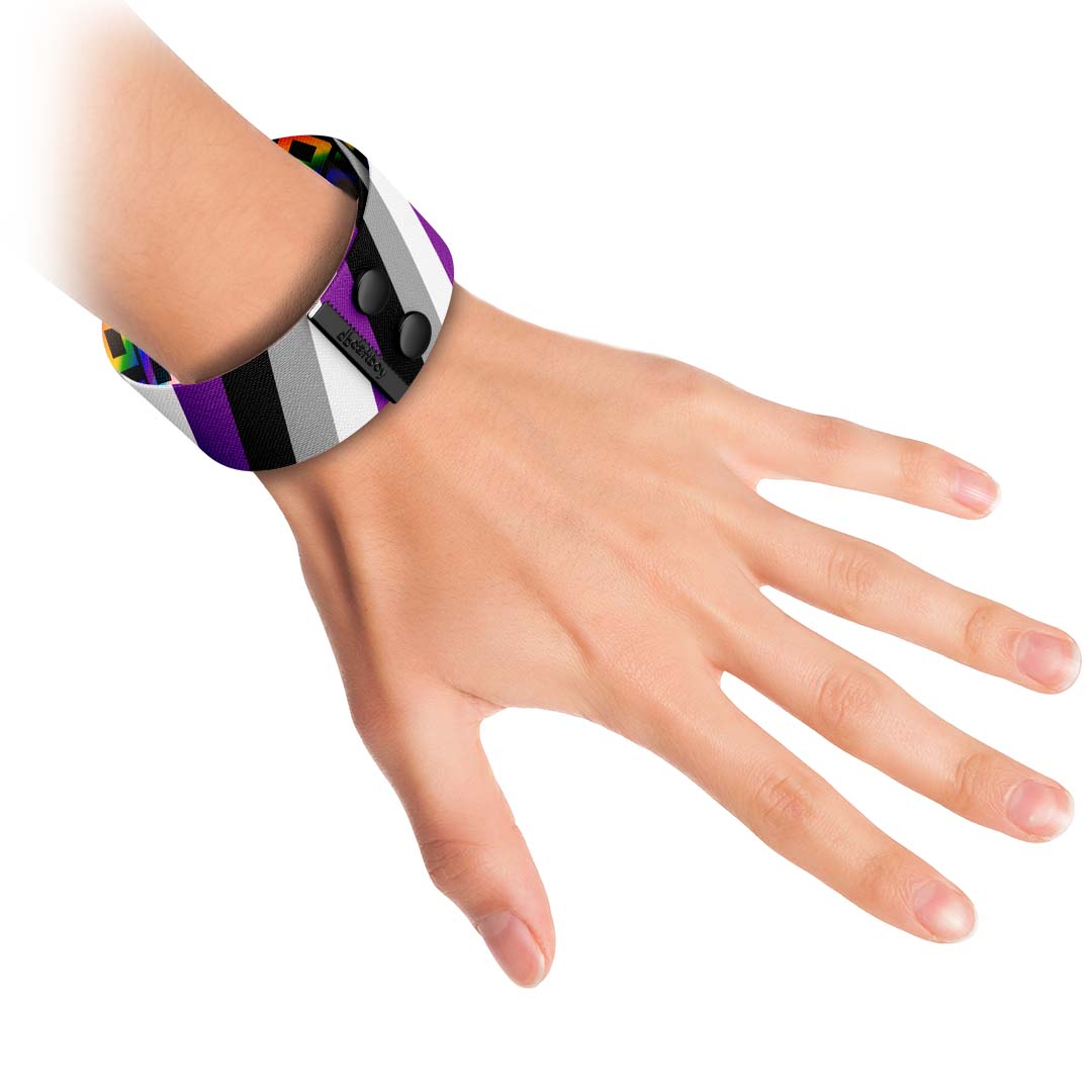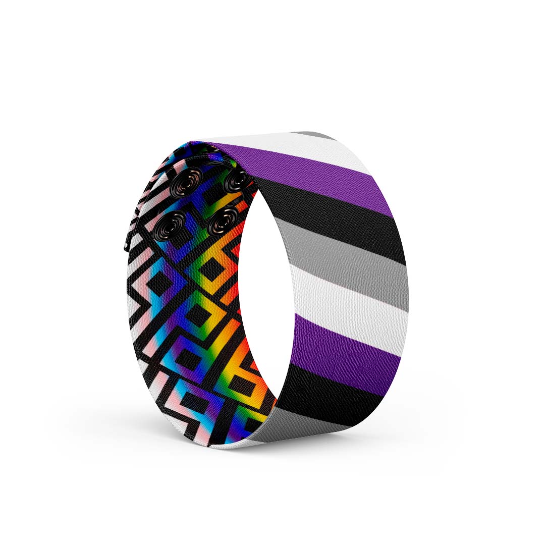 This UnisexΒ Gender-Neutral Fashion Thicc Cuff Bracelet is made fromΒ soft High-Quality Recycled Polyester strap and features Pride Asexuality Colors on the outside with our signature DB rainbow pattern inside!Β