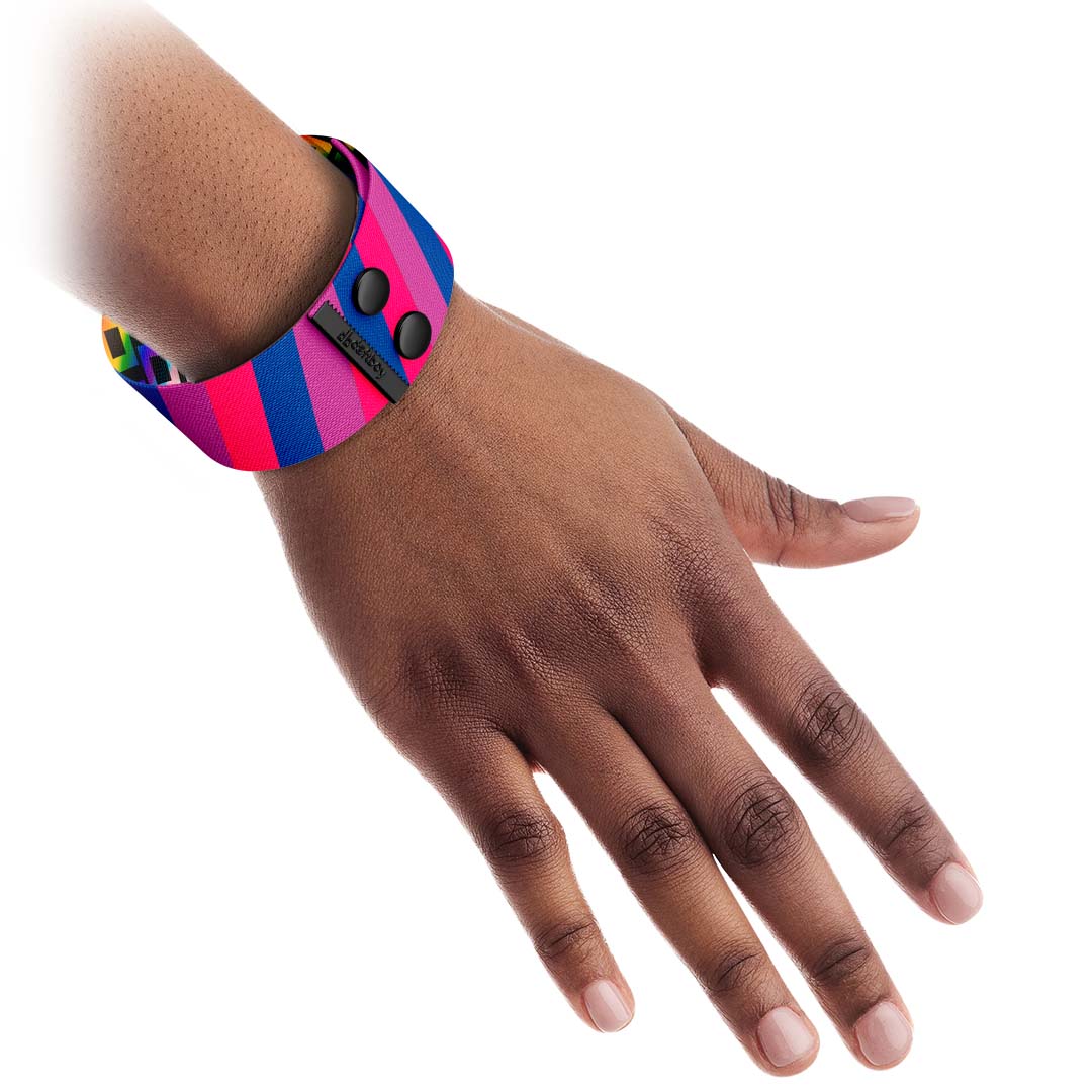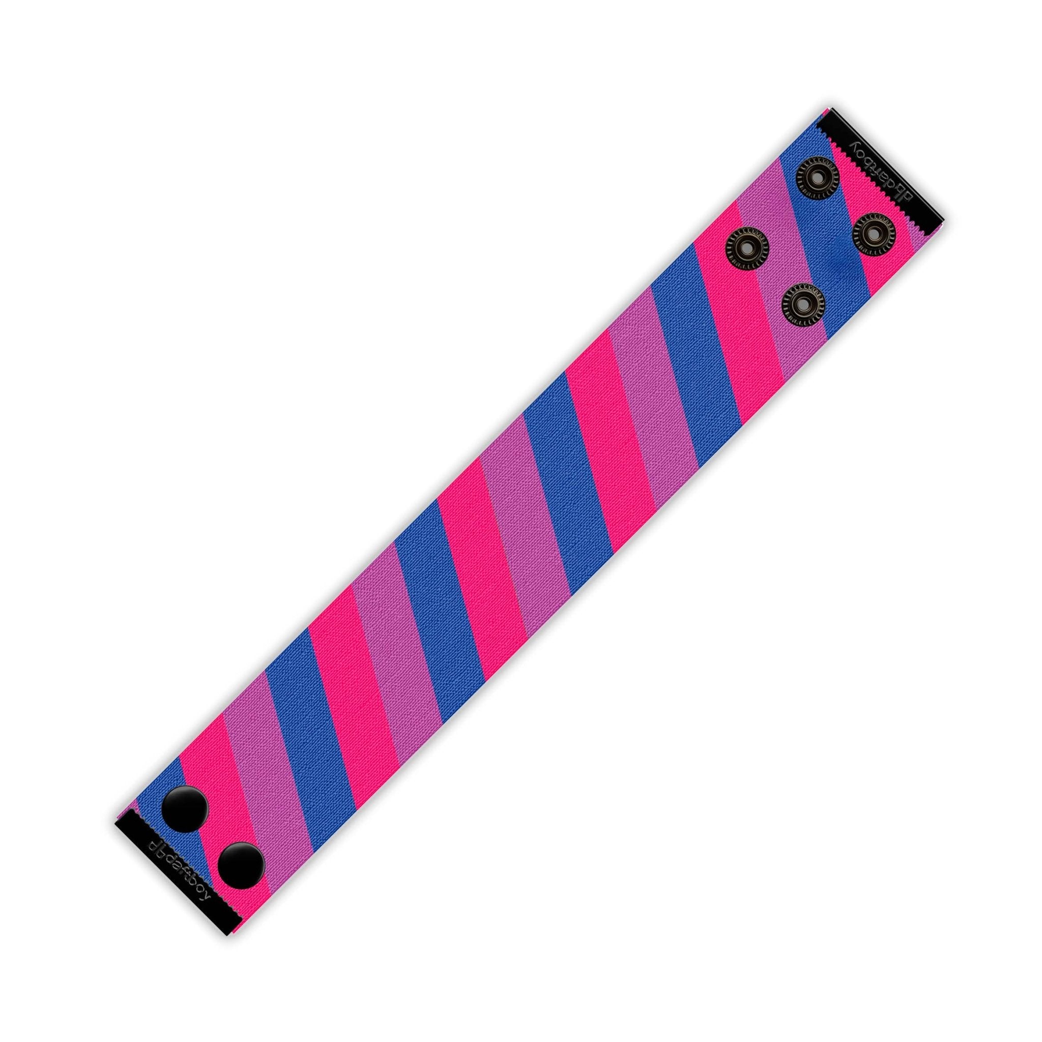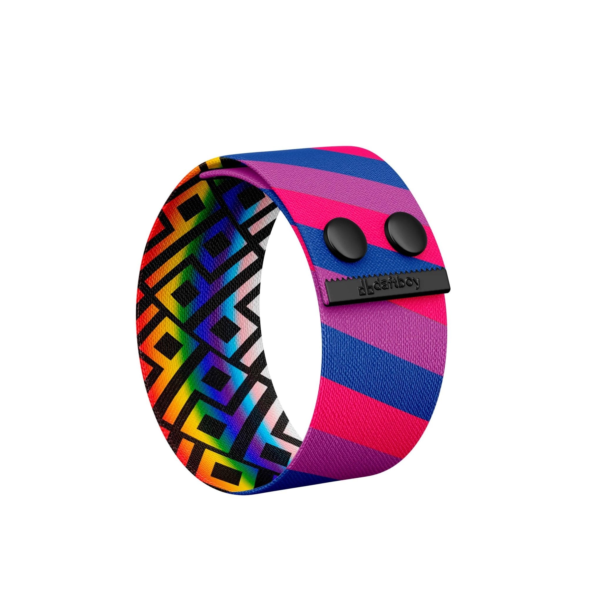 This UnisexΒ Gender-Neutral Fashion Thicc Cuff Bracelet is made fromΒ soft High-Quality Recycled Polyester strap and features PrideΒ Bisexuality Colors on the outside with our signature DB rainbow pattern inside!Β