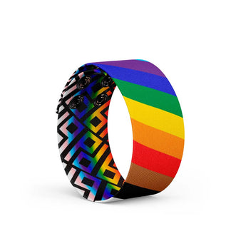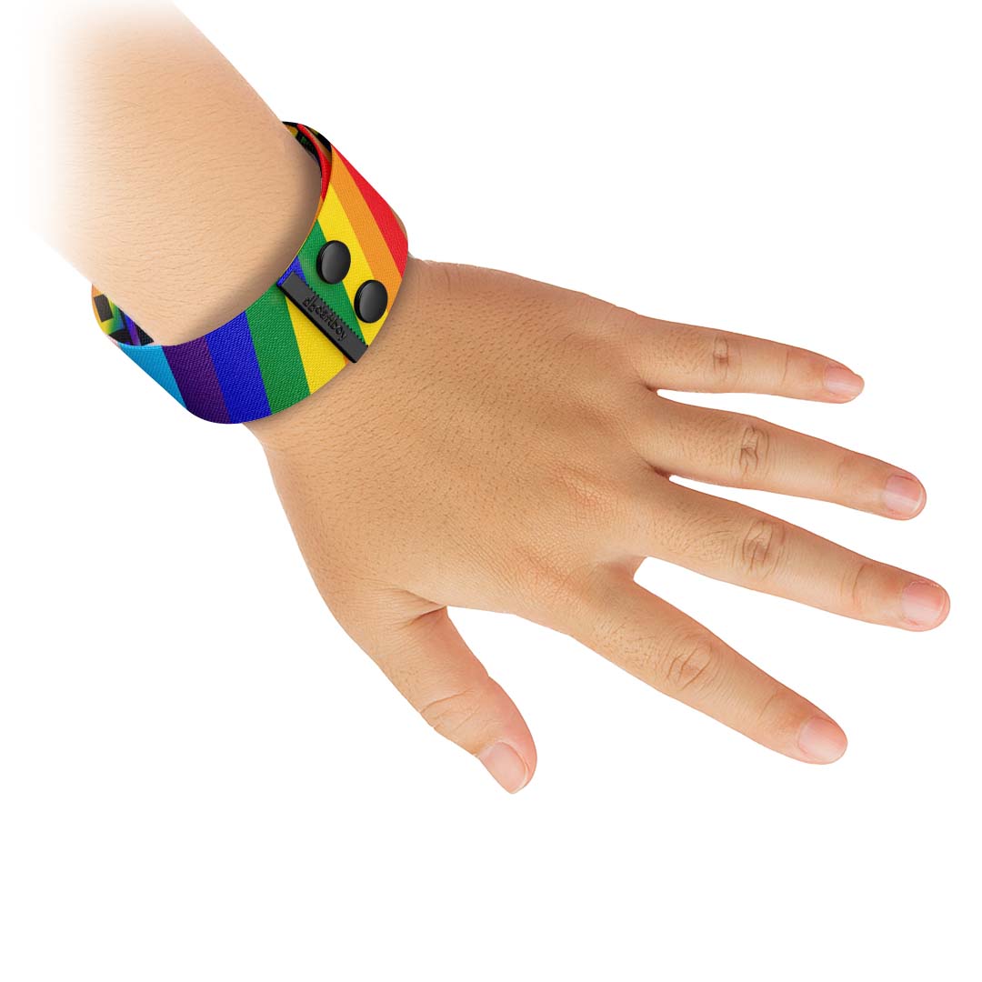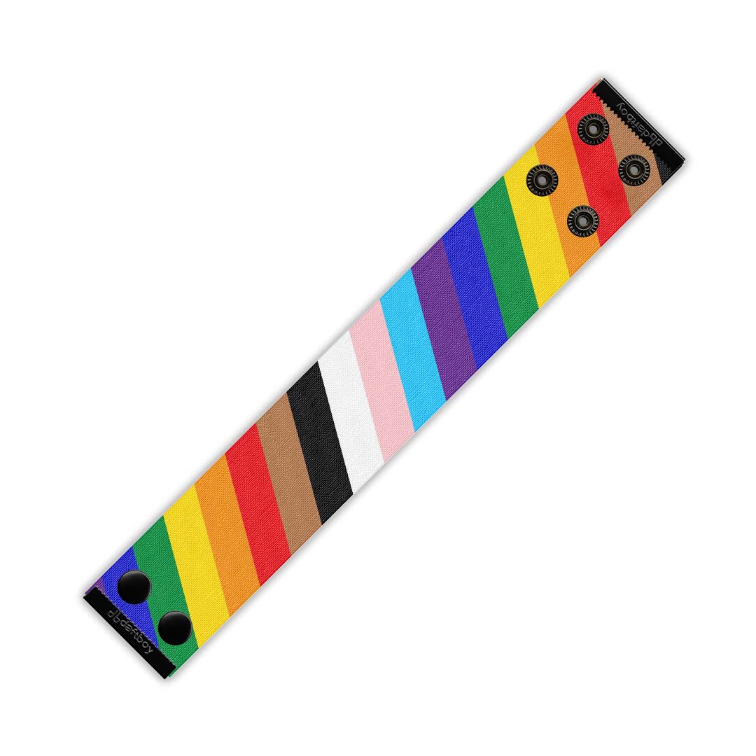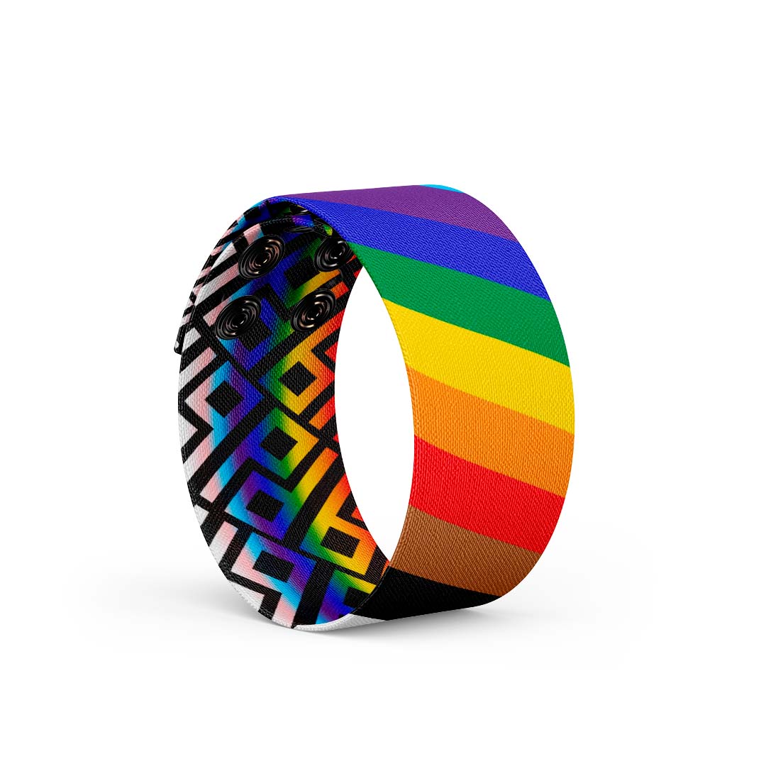 This Unisex Gender-Neutral Fashion Thicc Cuff Bracelet is made from soft High-Quality Recycled Polyester strap and features Pride Inclusion Colors on the outside with our signature DB rainbow pattern inside!