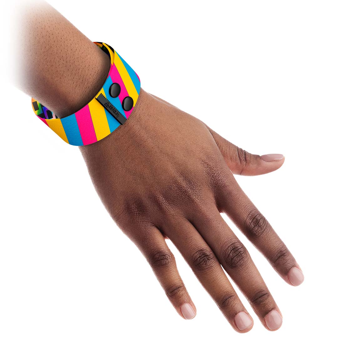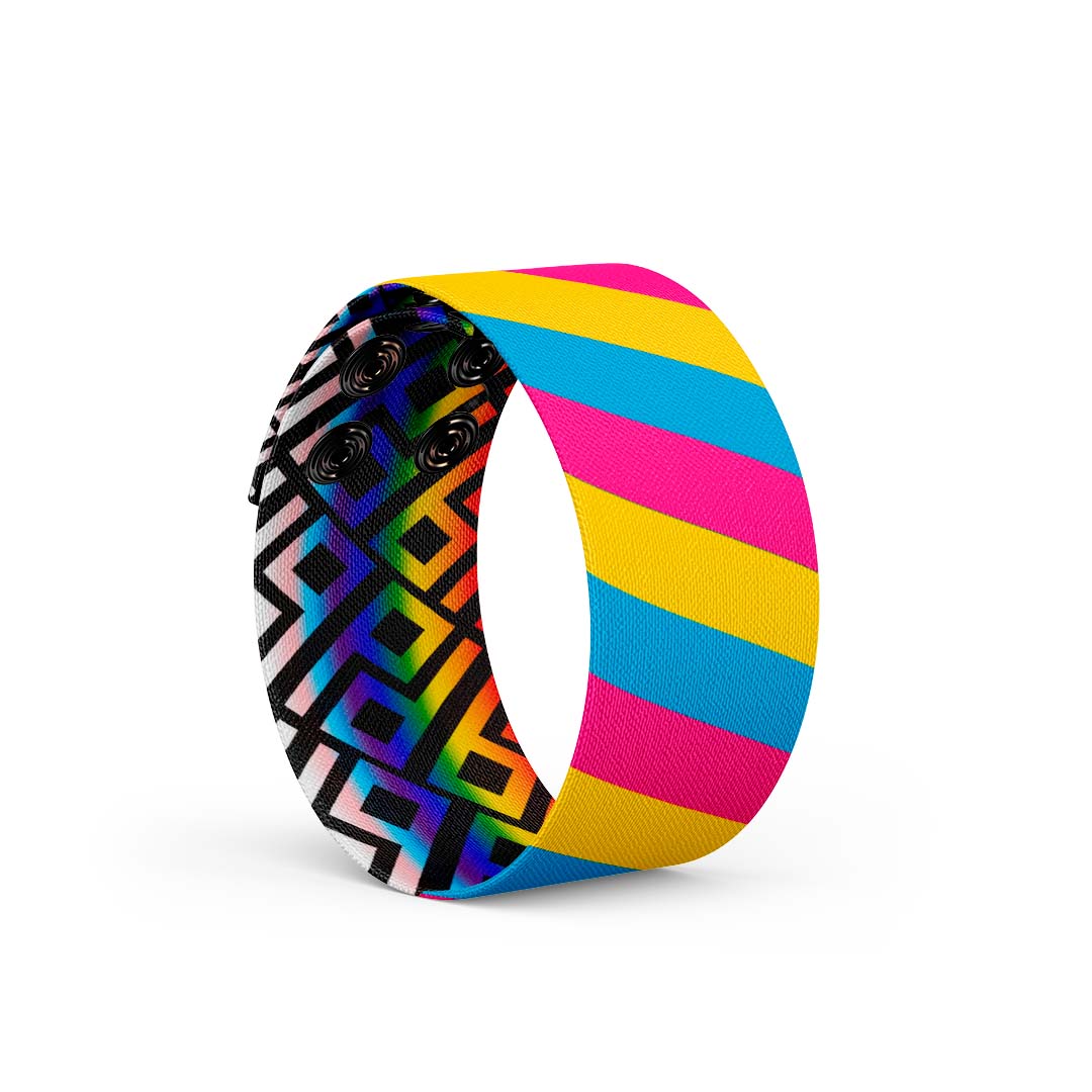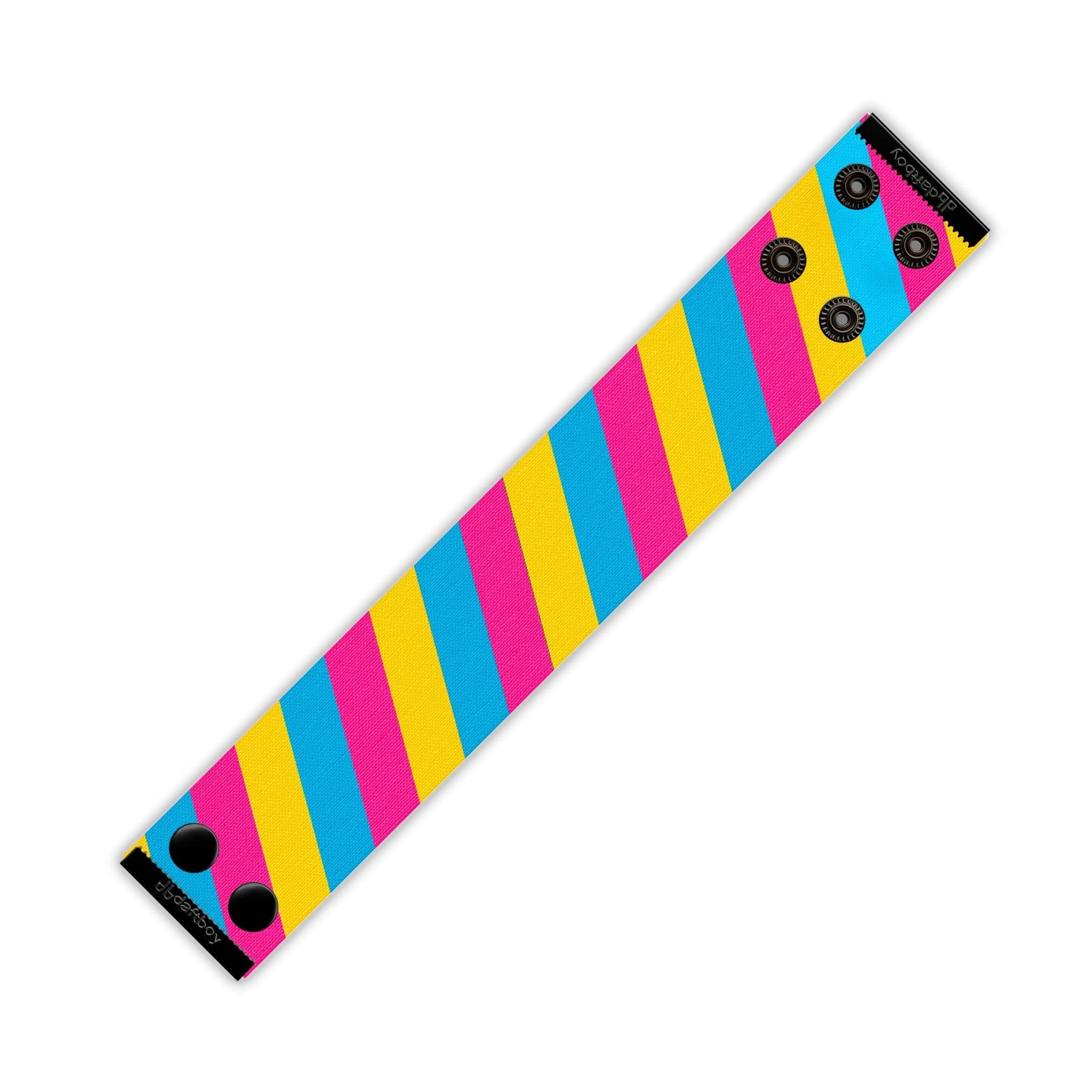 This Unisex Gender-Neutral Fashion Thicc Cuff Bracelet is made from soft High-Quality Recycled Polyester strap and features Pride Pansexuality Colors on the outside with our signature DB rainbow pattern inside!
