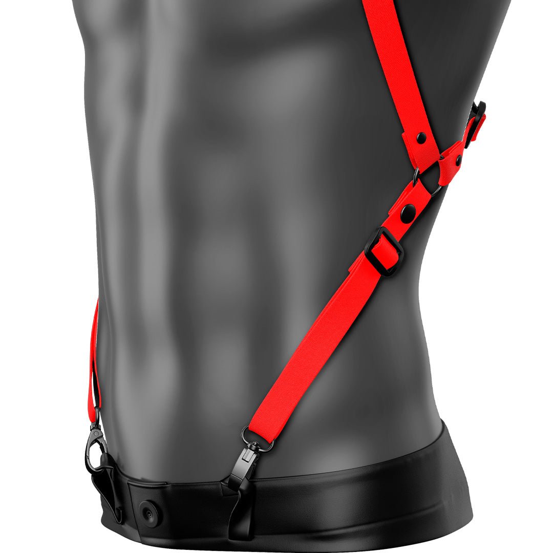 - 2 Removable Torso Straps with clips Connect To Belts, Belt Loops (As Pictured), Fan Holsters, Each other or something else down below.