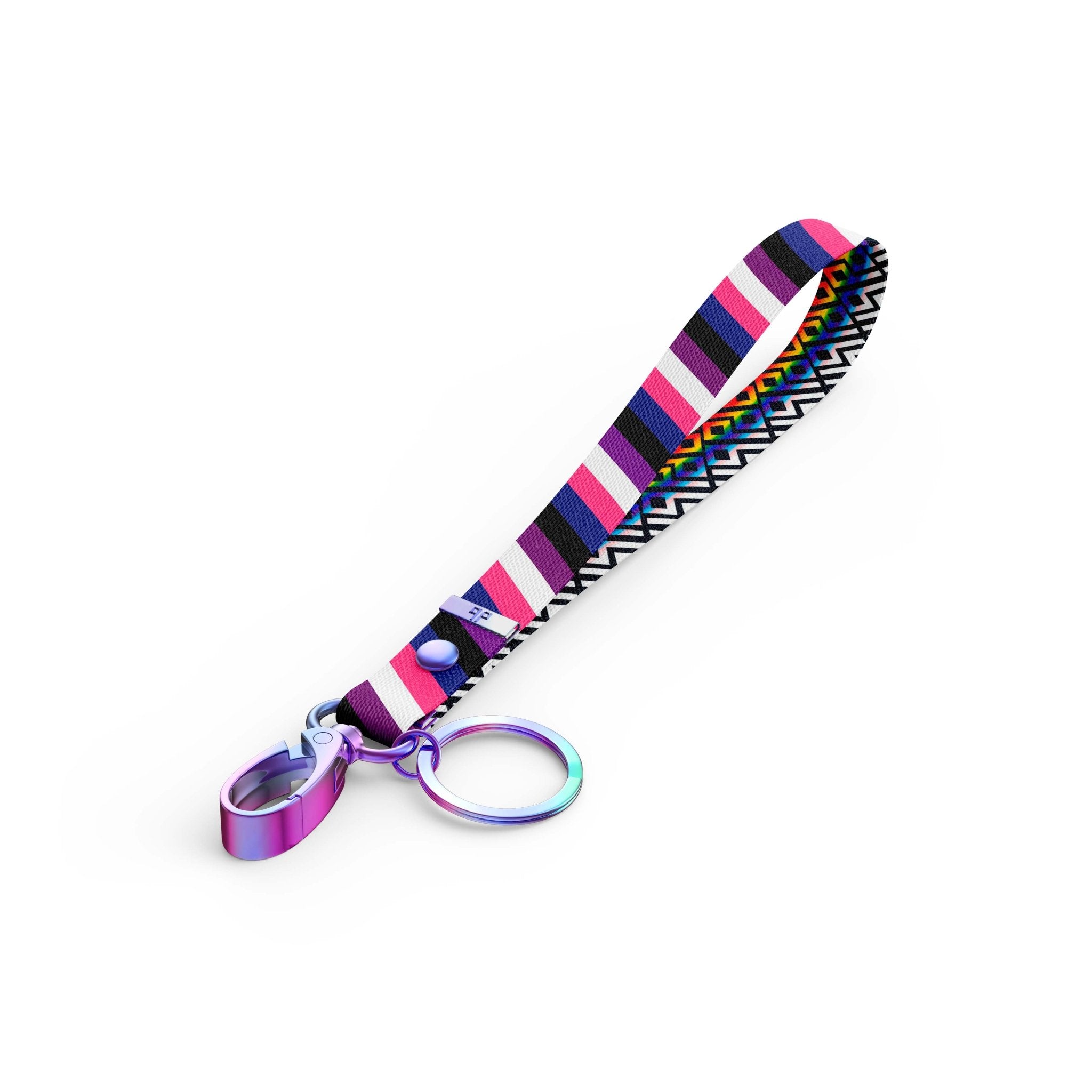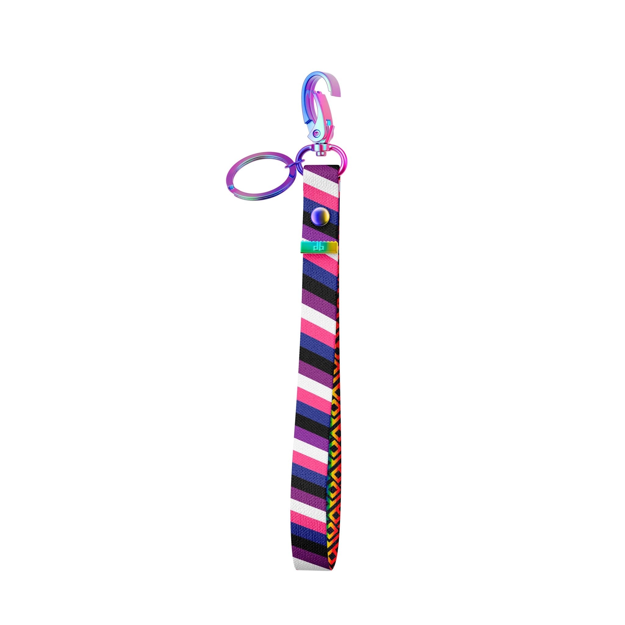 This Key Clip Strap Wristlet is made from soft High-Quality Recycled Polyester strap and features Pride Gender-fluid Colors on the outside with our signature DB rainbow pattern inside!