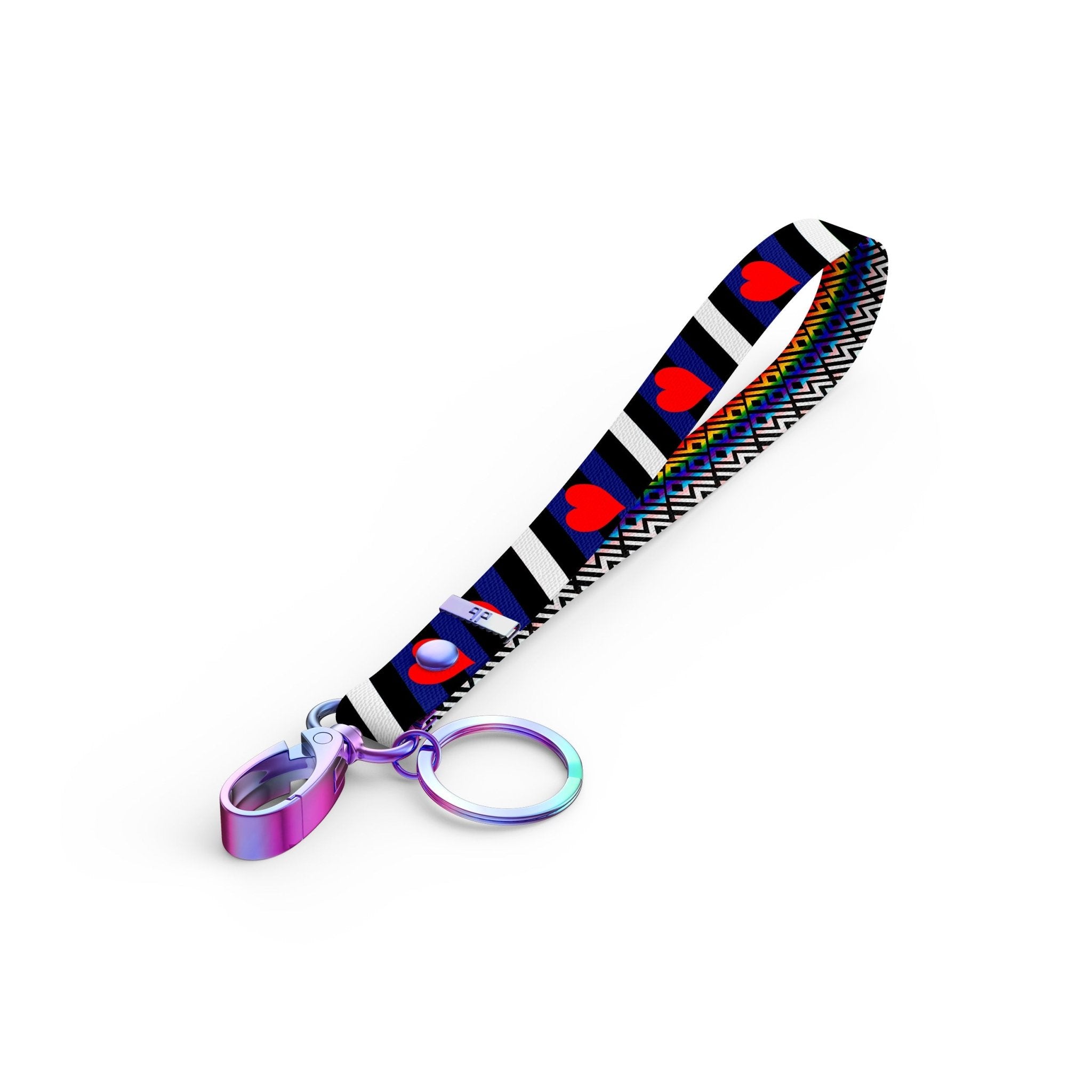 This Key Clip Strap Wristlet is made fromΒ soft High-Quality Recycled Polyester strap and features Pride Leather Flag Colors on the outside with our signature DB rainbow pattern inside!Β
