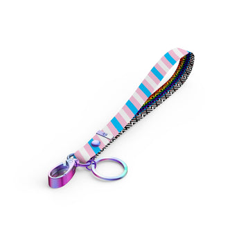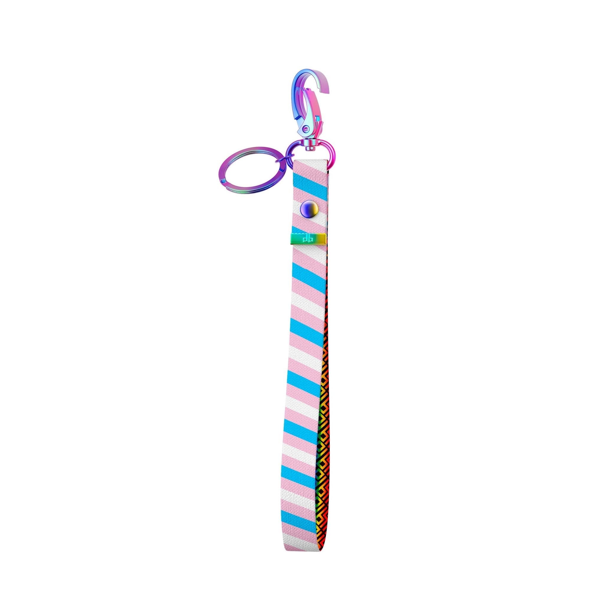 This Key Clip Strap Wristlet is made fromΒ soft High-Quality Recycled Polyester strap and features Pride Transgender Colors on the outside with our signature DB rainbow pattern inside!Β