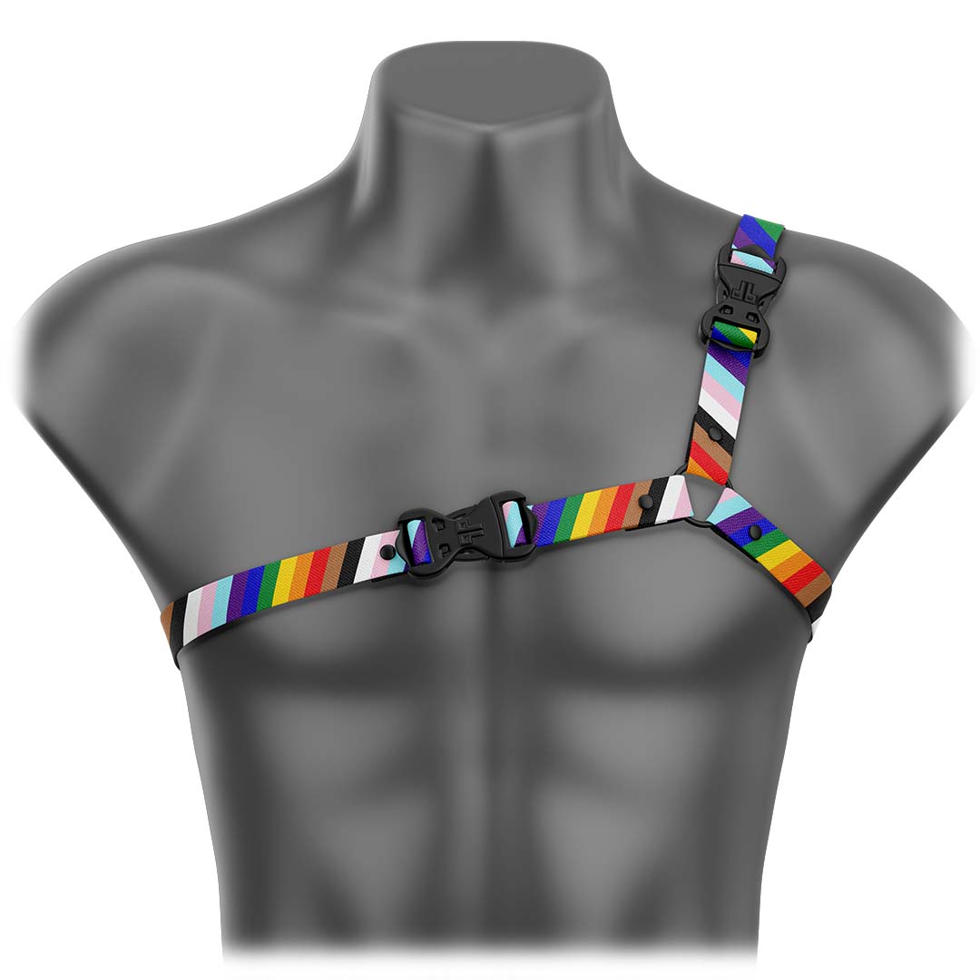 This NEW Ultra-Thin version of the original Unisex Gender-Neutral Asymmetrical Fashion Harness features Pride Inclusion Colors on the outside and our DB pattern inside soft High-Quality Recycled Polyester strap.Β  It's not all the Pride Colors... But It's Close! Matches our Pride Inclusion Fan!