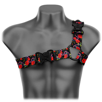 This Unisex Gender-Neutral Asymmetrical Fashion Harness features a vibrant design on the outside and our DB pattern inside soft High-Quality Recycled Polyester strap. Matches our Snakes And Roses Fan!