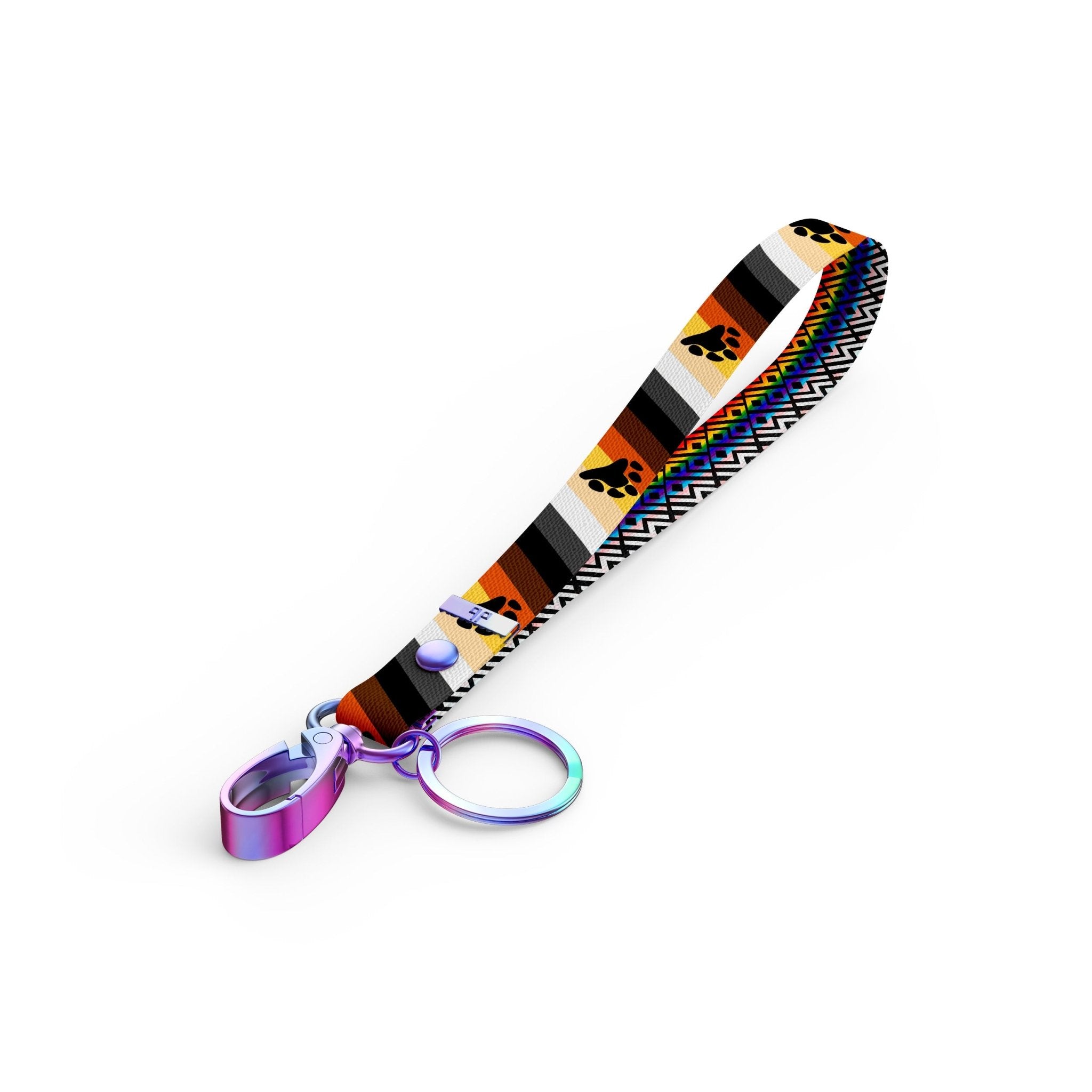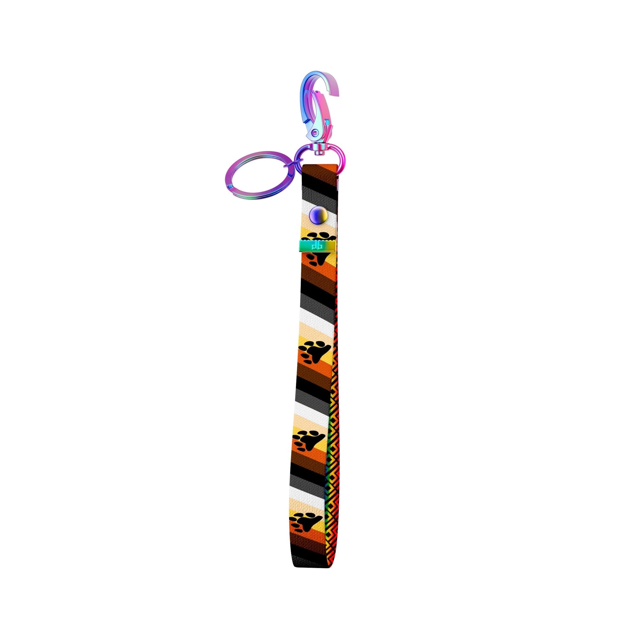 This Key Clip Strap Wristlet is made fromΒ soft High-Quality Recycled Polyester strap and features Pride Bear Culture Colors on the outside with our signature DB rainbow pattern inside!Β